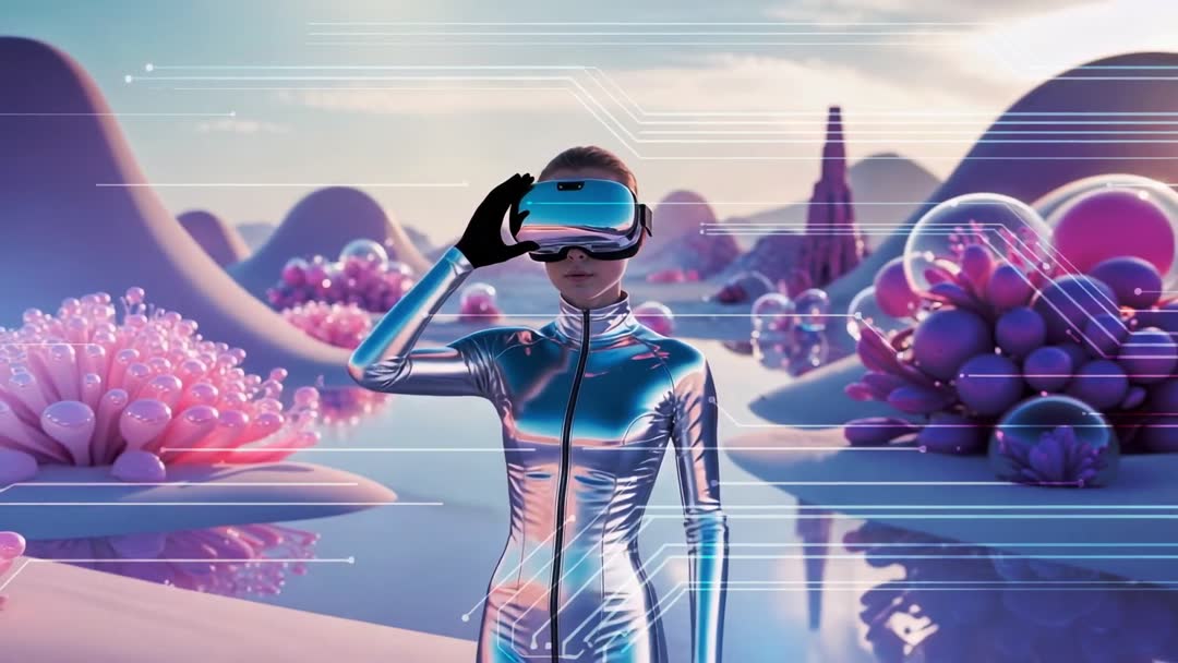 AI Generated Image. This video depicts a woman in a chrome suit enjoying a virtual reality experience. She is in an otherworldly landscape filled with futuristic elements and colors. Illustrating high-tech and sci-fi themes, it perfectly suits websites related to technology, gaming, or digital arts. It is ideal for use in features highlighting innovative tech developments, gaming stories, or as promotional material for VR gear.