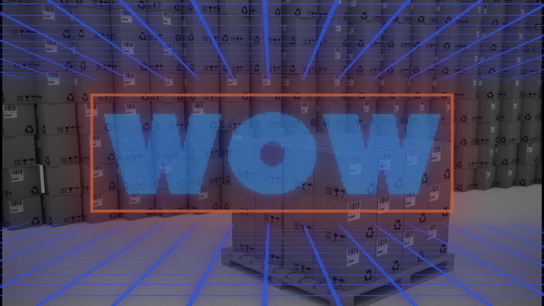 Futuristic WOW Text Overlay on Stacked Boxes Video