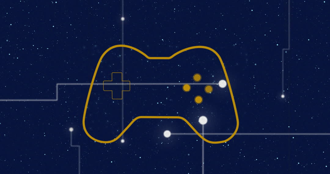 This vividly animated concept showcases a yellow video game controller blending with futuristic line design against a starry backdrop, symbolizing the intersection of gaming and advanced technology. Ideal for use in technology presentations, gaming websites, and futurism-related content.