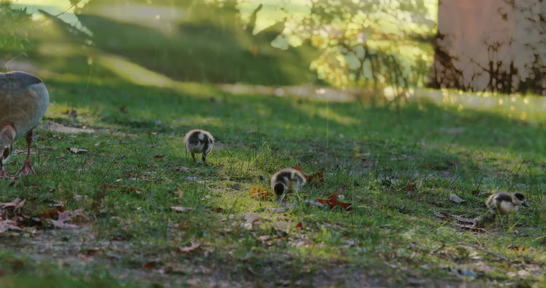 - Fuzzy Goslings Walking Amidst Autumn Leaves in Sunlight