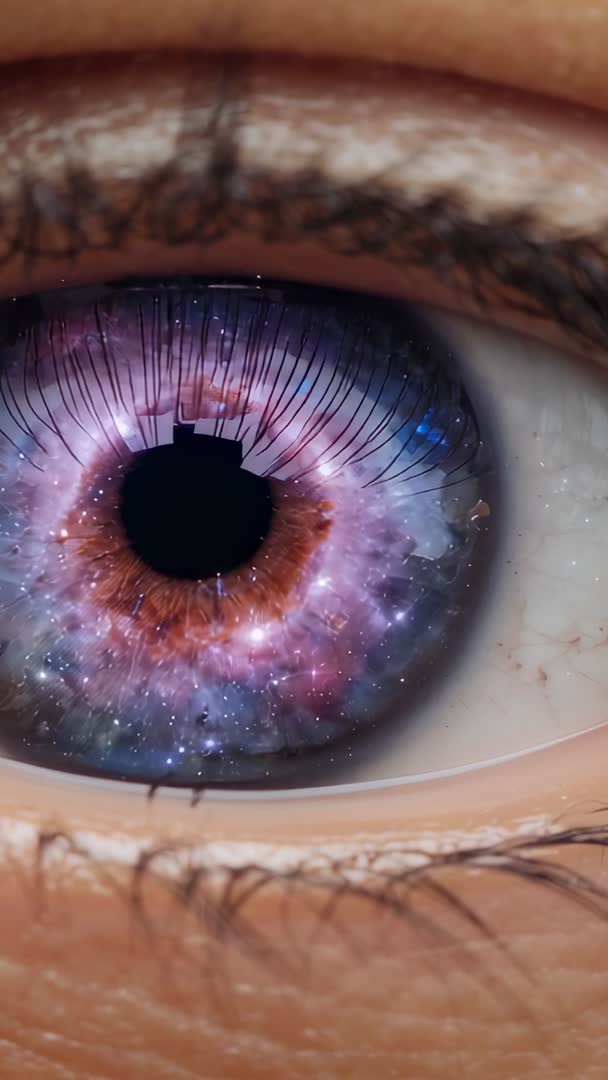 AI Generated Image. Showing extreme close-up macro of eye with galaxy-like iris reacting to rectangular light near camera lens. Capturing blink, pupil movement, and detailed eyelashes in vertical 9:16 format. Blending vibrant violet, blue, pink, and amber tones to create surreal nebula effect inside iris. Evoking themes of vision, inner universe, technology, and cosmic wonder. Suited for sci-fi title sequences, tech product promos, mindfulness or consciousness videos, music visuals, and social media reels. Pairing with ambient electronica or spoken-word narration about exploration, perception, or future vision. Providing guidance for post-production: boost magenta highlights, increase contrast, preserve iris detail, add subtle glow for nebula effect. Advising securing model release for commercial use when subject is identifiable.