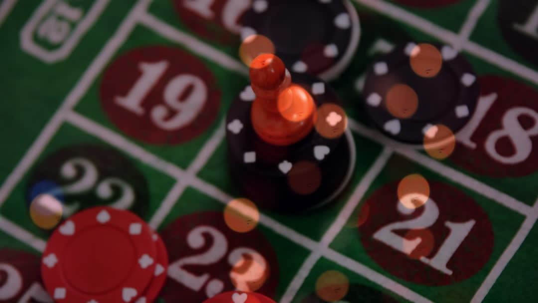 Visual of poker chips stacked on casino roulette table illuminated by animated light flares creates an ambient scene of a gambling environment. This can be used for casino or gambling-related promotions and events, themed advertisements, leisure magazines, or website backgrounds.