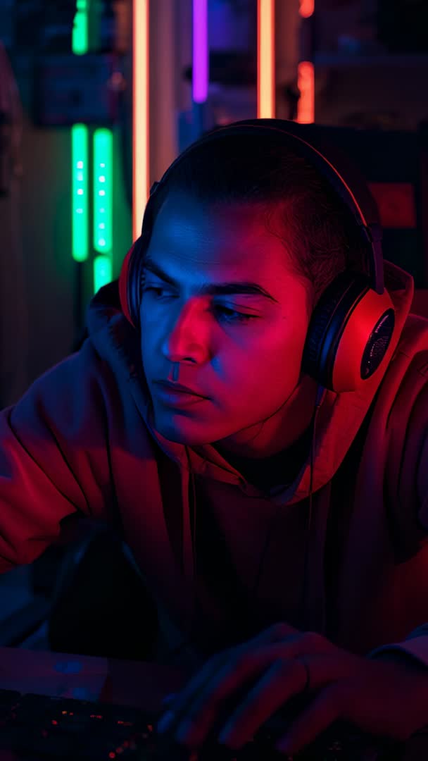 AI Generated Image. Showcasing gamer typing commands on keyboard under neon LEDs, streaming focused gameplay with moody RGB lighting. Conveying late-night concentration, tech-savvy lifestyle and immersive entertainment. Serving streaming channel thumbnails, YouTube Shorts, TikTok vertical ads, esports tournament promos, gaming gear and headphone campaigns, tech blog hero banners. Offering close-up portrait framing for highlighting headset and keyboard details. Encouraging color grading and subtle slow-motion for cinematic intro clips and social media teasers.