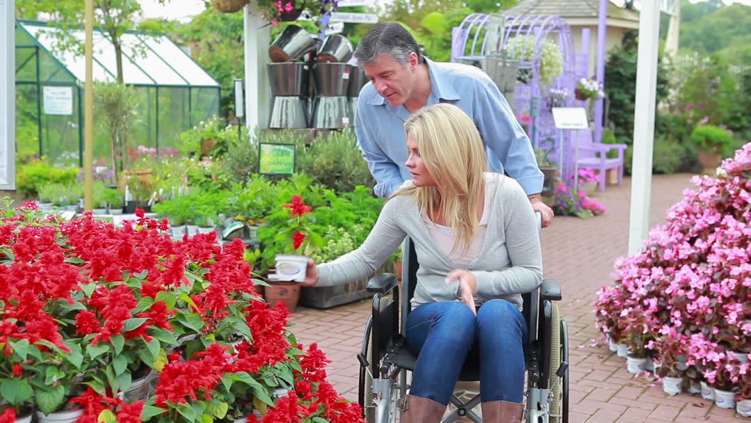 A couple spending time at a garden center. The woman, seated in a wheelchair, examines vibrant flowers alongside her partner. This scene highlights accessibility and the joys of exploring nature and horticulture. The video is ideal for use in campaigns promoting inclusivity, garden shopping experiences, and outdoor leisure activities.