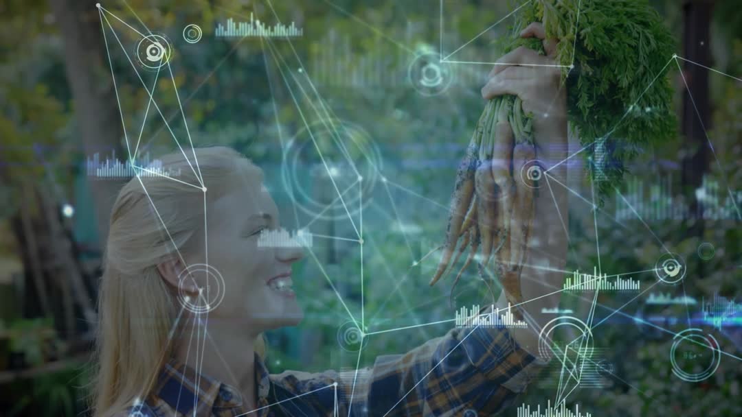 A woman gardener is holding up freshly picked carrots and examining them while technology-related data graphics overlay the scene, indicating the use of agricultural technology in organic farming. This video is ideal for illustrating advancements in farming, sustainable agriculture, and the integration of technology in agriculture. Perfect for use in educational content, sustainability projects, or agritech promotions.