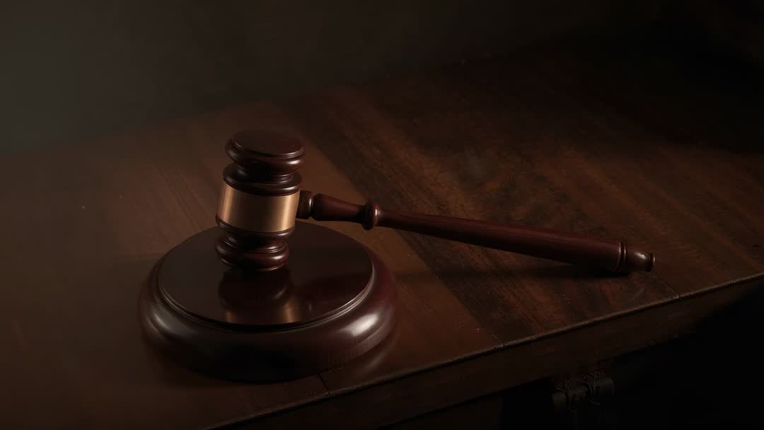 AI Generated Image. Video frame showing wooden gavel resting on sound block with brass band, captured during slow camera pan across mahogany bench. Low-key, moody lighting and rich woodgrain tones creating dramatic legal atmosphere and emphasizing brass highlight. Close-up composition leaving negative space on right side for title text, lower third graphics or logo overlay. Suiting courtroom drama trailers, law firm branding reels, legal news packages, documentary segments and educational explainer videos about judicial process. Editing suggestions: gentle push-in, warm color grade, subtle vignette and ambient court sound for authentic mood.