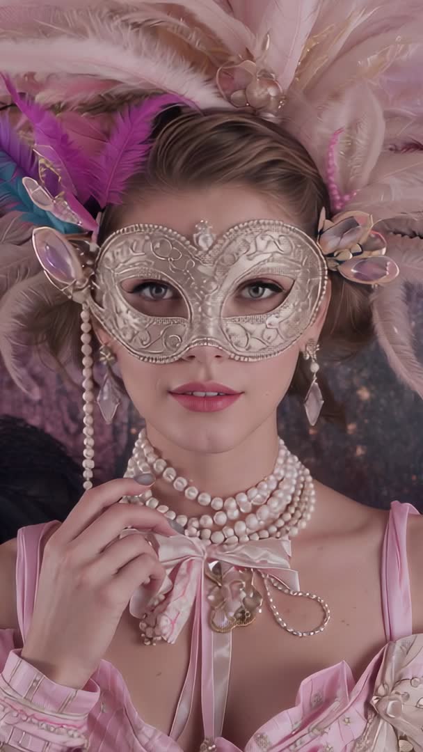 AI Generated Image. Video showing model gazing into camera while lifting and adjusting layered pearl necklaces and corset ribbon, revealing ornate metallic mask and feathered headpiece. Soft pastel pink palette, warm cinematic lighting, and shallow depth of field creating romantic, luxurious mood. Close-up vertical composition focusing on face and jewelry, offering usable hero clip for social media reels and vertical ad formats. Ideal for fashion campaigns, beauty tutorials, luxury jewelry promos, bridal editorial, masquerade event marketing, vintage costume projects. Suggested edits: overlaying elegant type treatment, adding slow cinematic reveal, syncing gentle piano or string music, cropping for Instagram Stories and TikTok.