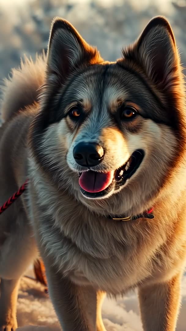 AI Generated Image. Vertical video showing close-up of Alaskan Malamute gazing toward camera while standing on snow, panting and ready to pull sled. Warm golden backlight highlighting thick fur, alert ears, and expressive brown eyes; red leash and harness hinting at mushing action. Ideal for promoting winter adventure and travel campaigns, illustrating sledding and mushing tutorials, supporting pet care and grooming content, powering social media reels and mobile-first ads, and enriching editorial features on working dogs and arctic lifestyles. Crop-safe vertical framing and dynamic subject motion offering flexible use for short-form video, website hero loops, banner ads, and presentation backgrounds.