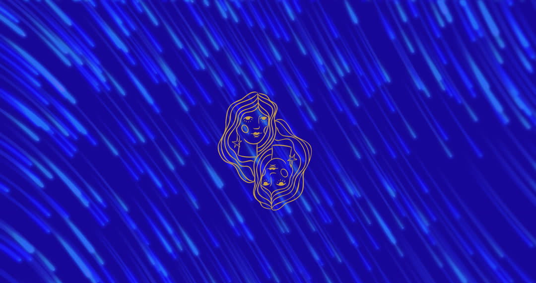Illustration showing artistic representation of Gemini zodiac sign with two female faces. Illuminated blue lines create a sense of movement reminiscent of meteor showers or outer space themes. Suitable for use in astrology-related content, horoscope presentations, or graphic design involving cosmic and celestial motifs.