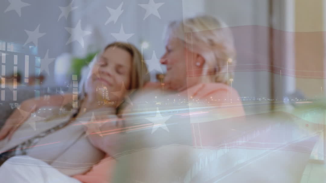 Image depicts heartfelt moment of senior woman and adult daughter smiling and embracing, overlaid with USA flag and subtle cityscape backdrop. Represents themes of family bonds, national pride, and tender connections across generations. Ideal for use in advertisements, political campaigns, family-oriented promotions, and articles on aging or family matters.