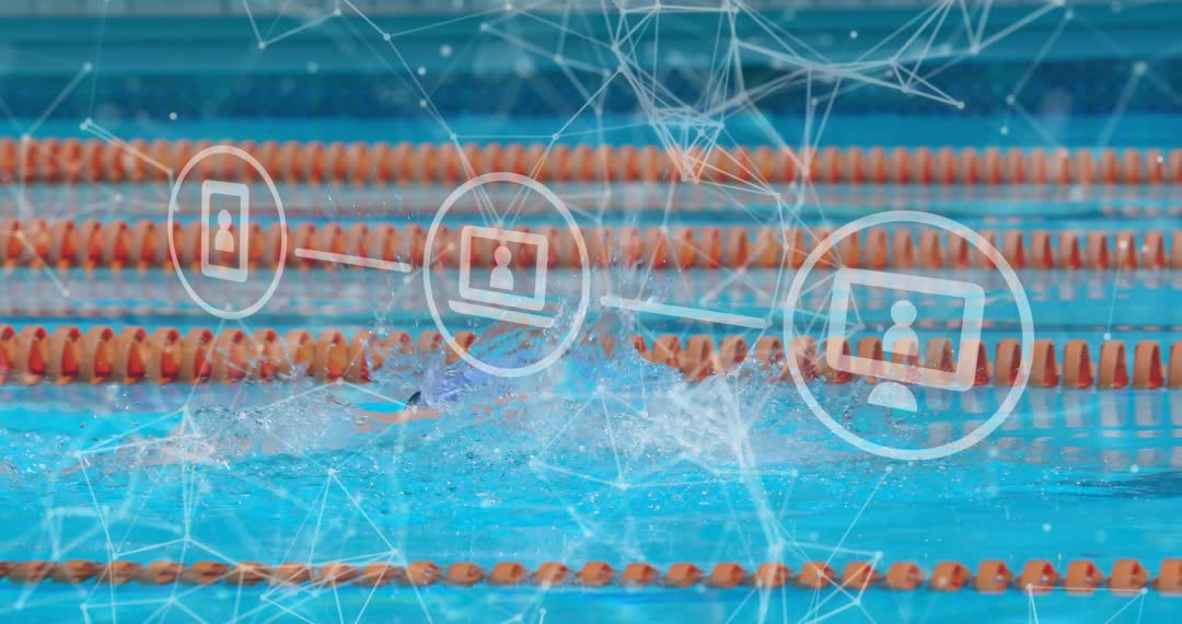 Shot effectively depicting competitive swimming complemented with a digital network overlay showcasing technology integration in sports performance analysis. Useful in articles or media focusing on technological advancements in athletics, the relationship between sports and digital innovation, or promoting sports events and athlete training techniques.