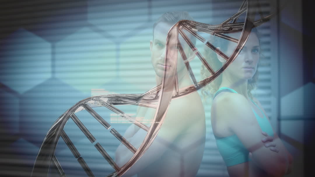 This video illustrates the relationship between genetics and fitness, portraying a digital rendition of a DNA helix passing crowded stronger individuals, suggesting themes of personal health optimization and scientific advancement. Ideal for use in healthcare biotech presentations, genetic research articles, or educational materials focusing on the intersection of genetics and athletic performance.