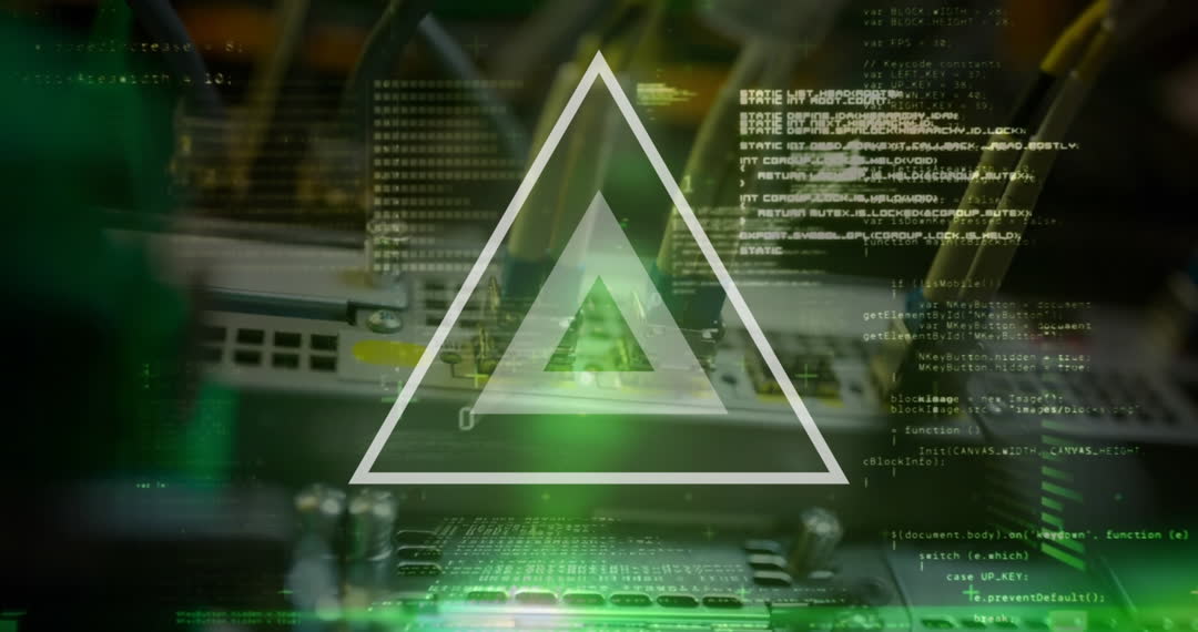 Abstract overlay of triangle patterns on computer server, illustrating intersections of technology and design. Suitable for tech blogs, network solutions promotions, data visualization in presentations, or educational content depicting modern data systems.