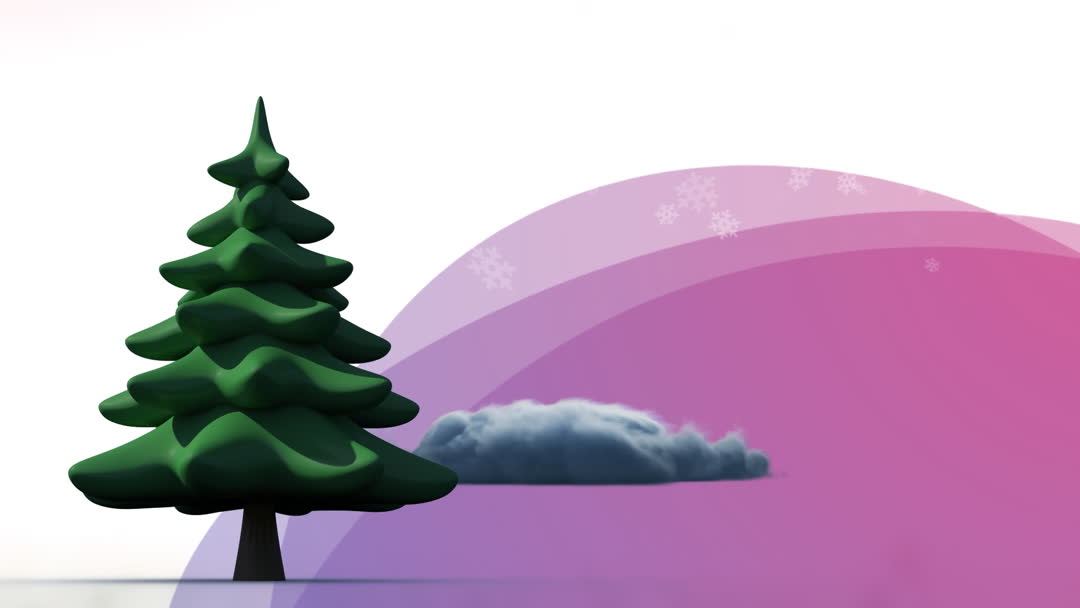 This scene showcases a digital composition featuring a stylized pine tree and cloud against a smooth pastel gradient with hints of snowflakes. The geometric styling and clean lines make it great for modern holiday graphics, creative backgrounds, and design projects with an artistic flair.
