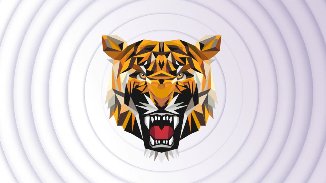 This digital artwork features a stylized geometric representation of a tiger's head atop a background with layered circular patterns. The vibrant colors and abstract design add a dynamic and modern appeal, suitable for use in graphic design projects, posters, and branding materials where a strong and bold video is needed. It can also be used in themes related to wildlife, animal symbolism, or contemporary art.