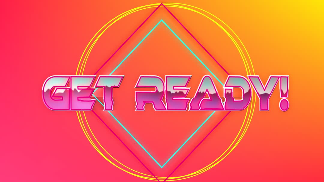 Bright and engaging text animation with the words 'Get Ready' in bold lettering against an energetic geometric and colorful background. Perfect for use in digital banners, video game startup screens, entertainment trailers, and promotional materials seeking a dynamic and modern aesthetic.