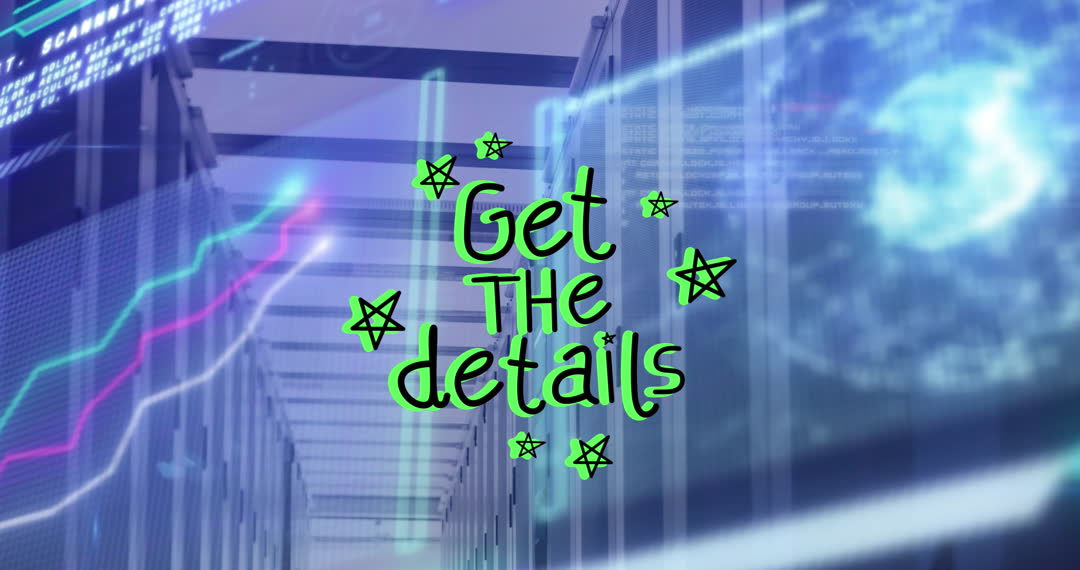 This visually engaging video features animated text saying 'Get the Details' on top of a blurred server room backdrop, capturing the essence of modern data management. Suitable for use in digital marketing, business presentations, and technology discussions. The blending of digital graphics emphasizes a forward-thinking, integrated tech experience.