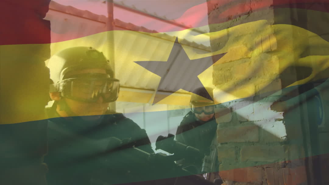 - Ghanaian Flag Blending with Determined Soldiers in Action