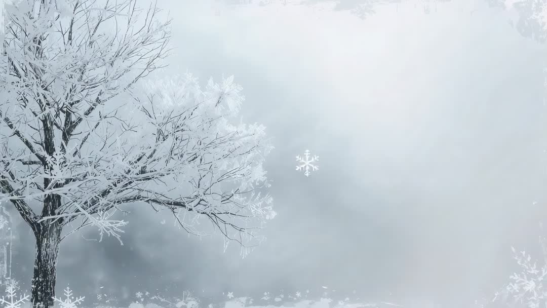 AI Generated Video. Showing single large snowflake drifting slowly across misty winter scene while frosted tree with icicles anchors left frame, creating quiet minimalist mood. Featuring wide negative space for headline text, logo placement, or lower third graphics. Providing soft cool tones and subtle texture ideal for website hero banners, social media stories, looping background video, holiday greeting animations, or meditation and relaxation apps. Highlighting delicate snow crystal detail and frosted branch silhouettes for editorial winter themes, seasonal promotions, weather reports, and cinematic title sequences. Offering easy color grading and seamless loop potential for ambient video installations and calming visual content.