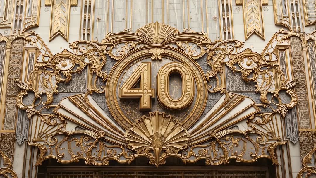 AI Generated Image. Camera panning across gilded Art Deco medallion numbered 40, revealing fan motif and intricate filigree in smooth motion. Close-up framing emphasizing symmetry, layered relief and lacquered gold finish, with shallow depth of field adding cinematic drama. Warm golden tones and directional lighting highlighting texture and decorative carving, while wide aspect composition allowing flexible cropping for widescreen projects. High-resolution detail serving brand identity, anniversary campaign, luxury hospitality promo, theater restoration feature or architectural documentary. Usage ideas: opening title for 40th anniversary video, hero background for website or social media reel, motion graphic overlay for event promotion, editorial illustration for design magazine, museum exhibit loop or signage.