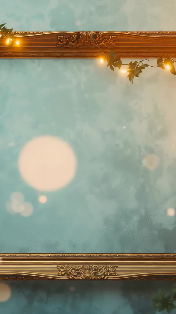 AI Generated Image. Featuring gilded frame border along top and bottom edges, fairy lights twinkling and ivy vines swaying against soft teal backdrop with drifting bokeh orbs. Looping vertical clip crafted for portrait orientations and mobile-first content. Ideal for social media stories and reels, mobile ads, wedding invitation overlays, seasonal greeting cards, product showcase frames, and title or intro screens. Ready for text or logo placement in center area, with natural negative space for headlines or call-to-action. Simple to customize by adding overlay text, logo mark, color grading, or subtle zoom and parallax. Pairing suggestions include ambient music, soft instrumental tracks, or gentle nature soundscapes to enhance tranquil, elegant mood.