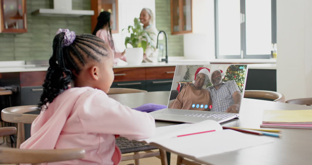 Young girl sitting at table engaged in a Christmas-themed video call with her grandparents displayed on laptop screen. The festive decor highlights a warm, connected celebration across technology. Ideal for illustrating remote gatherings, holiday communications, and family togetherness during special occasions.