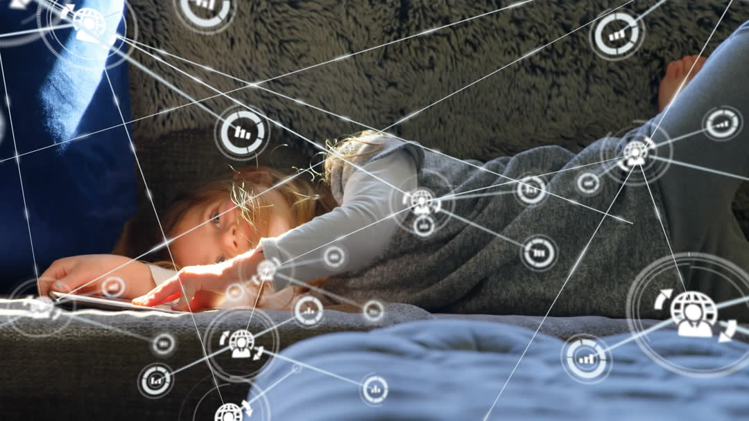 The video shows a young girl lying on a couch, engaging with her digital tablet. Overlaid with network icons, it represents technology and connectivity themes. Ideals for use in discussions about childhood use of technology, internet access for young users, and educational technology simulations.