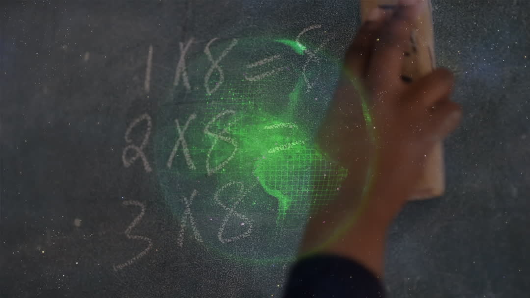 The video features a student's hand actively erasing math problems from a blackboard, overlaid with a glowing green globe. The juxtaposition highlights themes of globalization, the intersection of education and technology, and the pursuit of knowledge. This can be used for educational content, promotional materials for schools, or articles on innovative teaching methods.