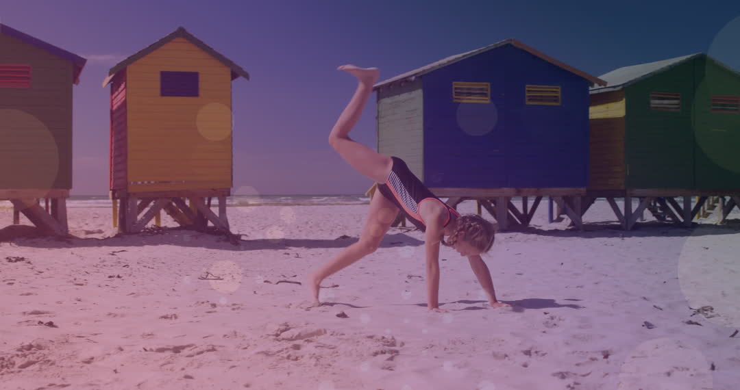 - Girl Practicing Handstands on Sunny Beach with Colorful Beach Huts