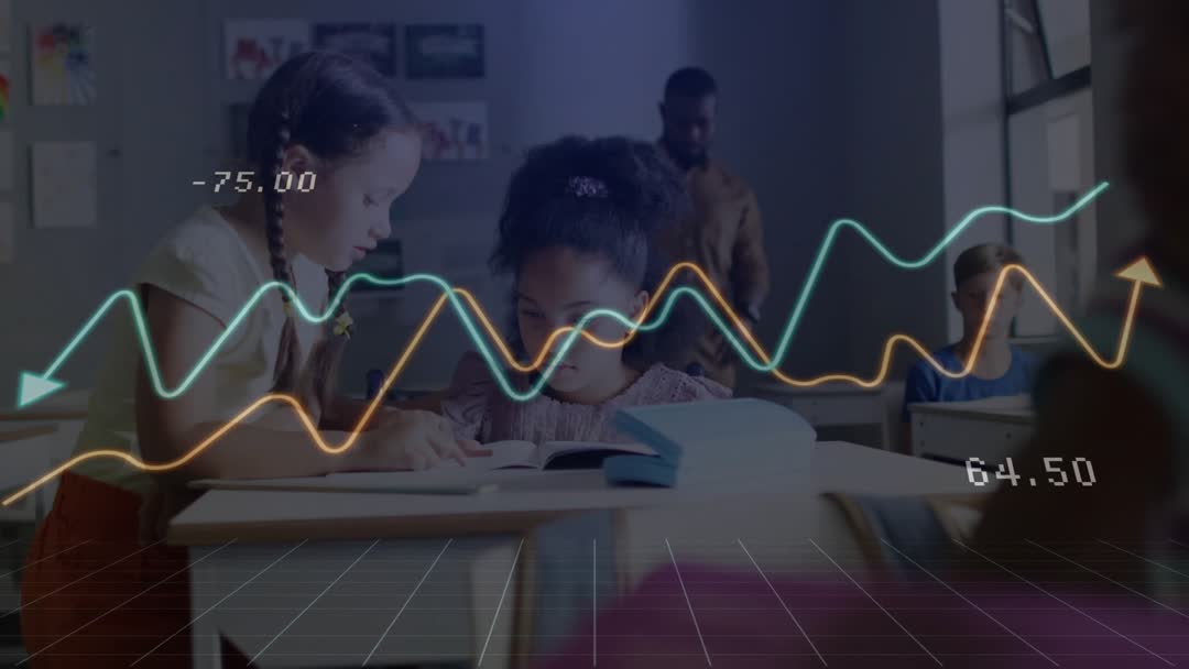 The video frame captures the enthusiastic interaction of two girls immersed in a science, technology, engineering, and mathematics (STEM) educational activity. Animated waveforms overlapping the classroom depicts innovative visualization approaches enhancing traditional academic experiences. Ideal for materials marketing cutting-edge education technologies, showcasing STEM engagement, promotional content focused on empowering young learners in interactive settings and identifying educational opportunities worth integrating in current teaching paradigms.