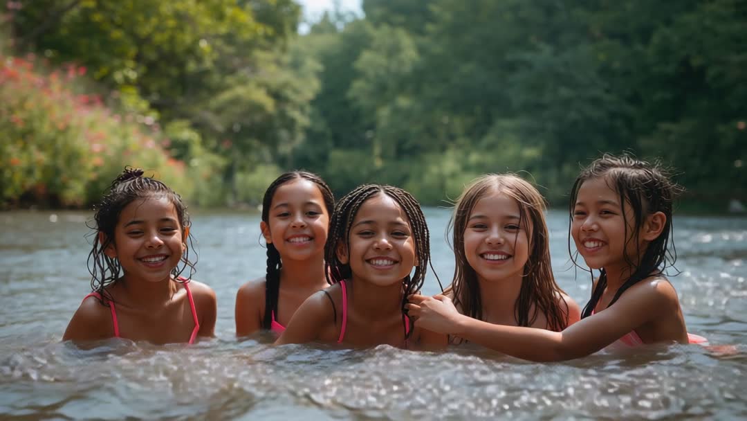 AI Generated Image. Video showing five girls laughing and wading in shallow forest stream, wearing swimsuits and enjoying sunny summer day. Camera is moving closer while girls line up for posing, water rippling around shoulders, smiles and playful interaction creating warm, authentic mood. Natural light and vibrant greens emphasize outdoor adventure and carefree childhood. Ideal for promoting summer camps, outdoor education programs, family travel, resort or lakefront marketing, social media reels, and lifestyle editorial about friendship and play. Useful as B-roll for commercials, website hero clips, or background footage for articles on health, nature, and childhood development. Clip is working well for projects wanting joyful, inclusive, and energetic visual storytelling.