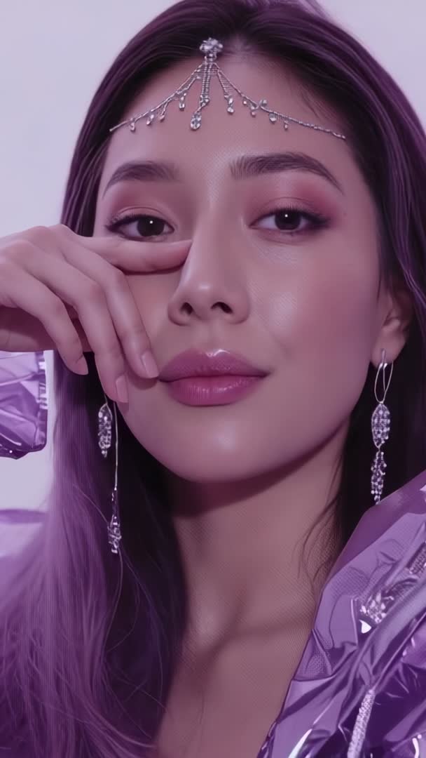 AI Generated Image. Vertical video featuring model tilting head and smiling while gently touching face, wearing jewel headpiece and long dangling earrings, dressed in metallic purple jacket. Close-up composition highlighting flawless makeup, glossy lips, soft smoky eyes, luminous skin under soft studio lighting. Color palette emphasizing violet and mauve tones creating luxurious, feminine mood. Suitable for beauty campaigns, fashion reels, influencer content, makeup tutorials, product advertisements, magazine editorials, social media stories, landing pages, cosmetics packaging. Pairing with ambient or downtempo music for cinematic mood or using as looped clip for Instagram Reels and TikTok. Cropping options for portrait or square formats, adding on-screen text for branding, or using as background for product overlays. Ideal for close-up beauty transitions, hero shots for jewelry or lipstick, and high-end commercial storytelling.