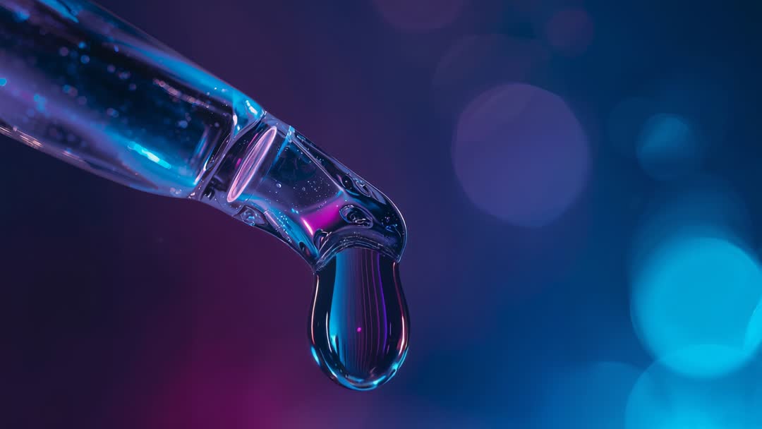 AI Generated Image. Close-up macro video showing glass dropper releasing neon-colored liquid, forming stretching filament and single droplet against moody cyan and magenta bokeh. High-contrast studio lighting highlighting glass reflections and liquid texture, capturing surface tension and viscosity. Suitable for cosmetic and skincare product promo, serum demonstrations, laboratory and science visuals, technology and abstract motion backgrounds. Loop-ready clip for hero backgrounds, social media reels, website headers, presentation slides, ad banners. Recommend using color grading, slow-motion edits, tight crops on droplet for product focus, and adding subtle sound design for immersive effect.