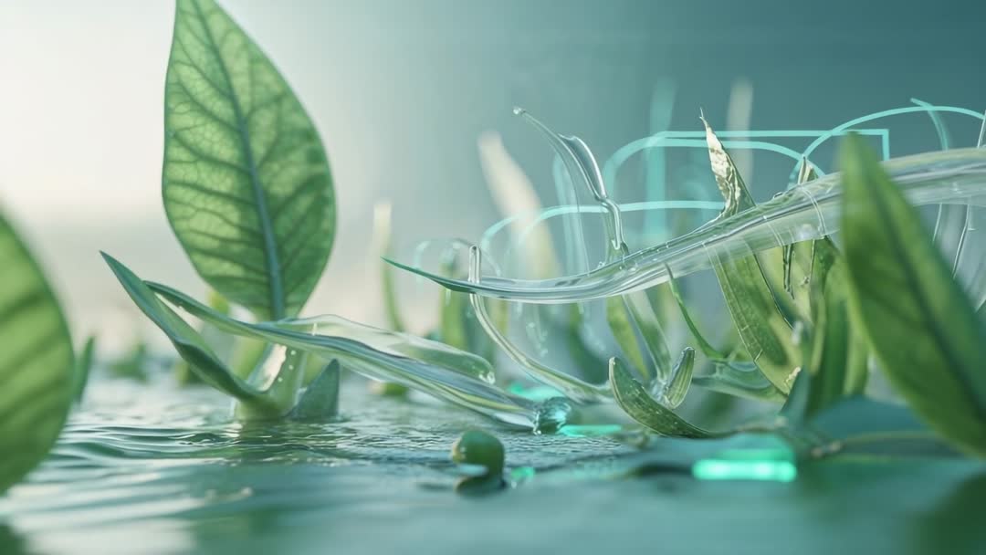 AI Generated Video. This serene abstract scene features glass tendrils intertwined with green leaves on a liquid surface that gently ripples. The reflective and minimalist design evokes a sense of tranquility and connection with nature. Suitable for backgrounds in wellness, spa design, environmental presentations, or any project emphasizing calmness and innovation.