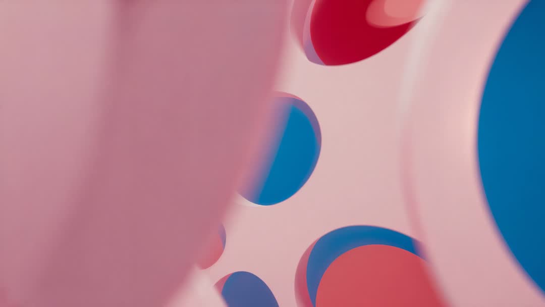 AI Generated Image. This abstract video offers a journey through a unique space filled with pale pink geometric forms and vivid red and blue discs, conveying a modern and minimalist aesthetic. Ideal for use in artistic projects, digital backdrops, or creative presentations, it can inspire design concepts or serve as dynamic visual content in technology and education pieces.