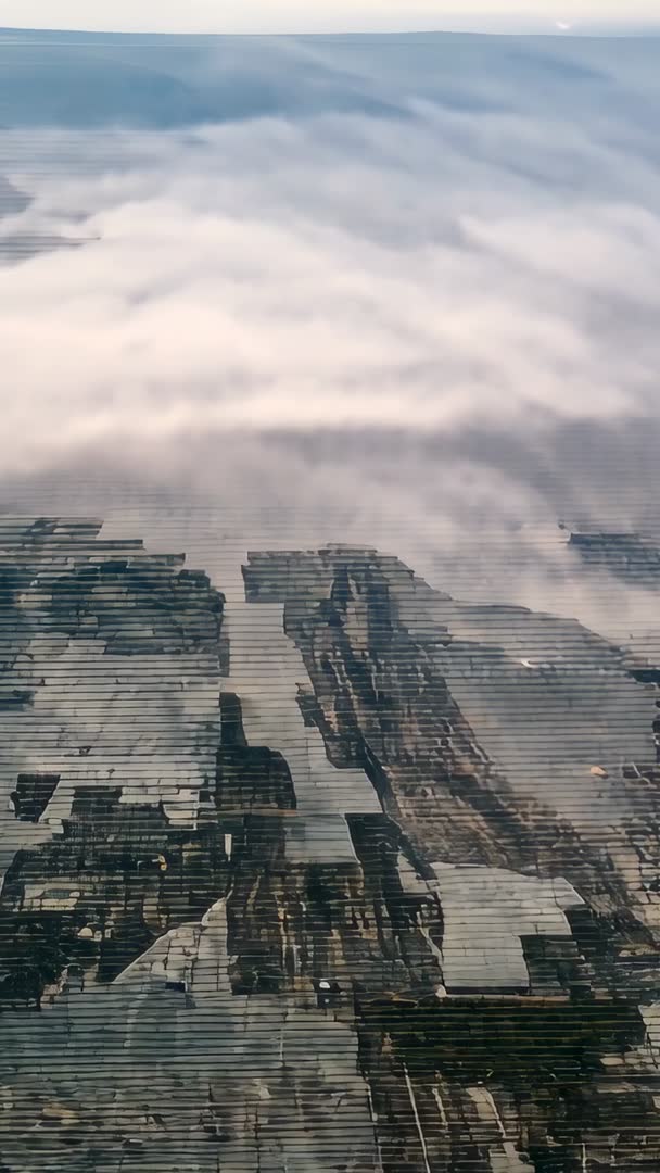 AI Generated Image. Vertical aerial footage showing sea fog rolling inland over coastal patchwork farmland and irrigation canals, revealing geometric field patterns and winding waterways under low cloud. Camera gliding smoothly over landscape, capturing contrast between soft fog and hard agricultural lines, scale and mood. Ideal for background footage in environmental documentaries, weather segments, agricultural monitoring, travel promos, cinematic openers, vertical social media reels, website hero banners, and mobile wallpapers. Suitable for overlaying titles, data visualizations, or voiceover narration for storytelling about climate, land use, irrigation, coastal weather, and rural landscapes. Clip working well in edits requiring atmospheric transitions, slow cinematic motion, or abstract texture layers.