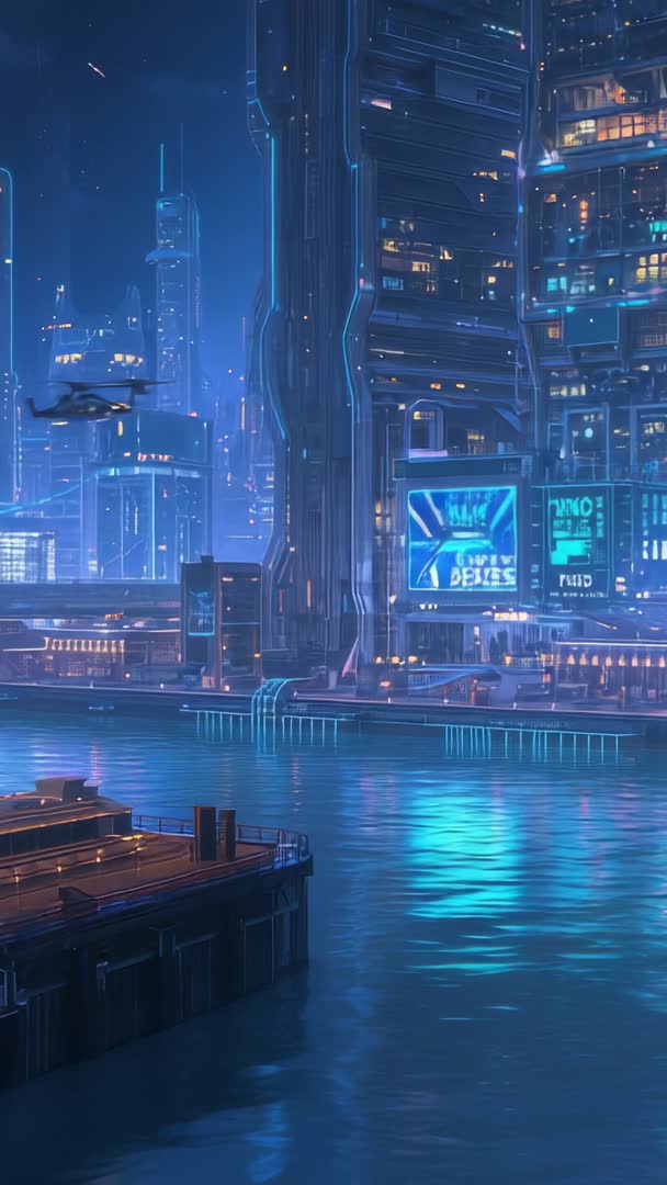 AI Generated Image. Scene showing gliding air taxi entering from left and passing towering skyscraper along neon-lit harbor. Evening skyline glowing with blue and cyan reflections on water, billboards flashing vibrant ads, windows revealing interior lights. Vertical video composition emphasizing height of architecture and movement of rotorcraft across frame, featuring foreground pier and layered depth into background high-rises. Suiting sci-fi film sequences, tech product promos, smart city concept videos, mobile wallpapers, social media reels, futuristic architecture presentations. Cinematic mood fitting advertising, game cinematics, urban planning visualizations, broadcast opening titles, and app onboarding screens.