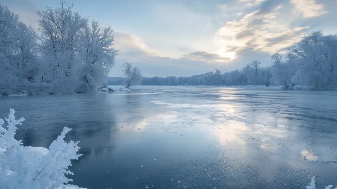 AI Generated Image. Showing camera gliding along frozen river at sunrise, revealing frosted shrubs, detailed ice texture, and soft sun glint on glassy surface. Composing near shore ice patterns with distant tree line to create calm blue-toned palette and strong sense of stillness. Emphasizing subtle reflections and delicate frost for atmospheric, cinematic mood. Ideal for nature documentaries, winter tourism promotions, seasonal advertising, relaxation or meditation backgrounds, website hero banners, and social media reels. Suitable for overlaying titles on upper sky area, looping for ambient background use, and pairing with gentle ambient music for wellness or storytelling projects.