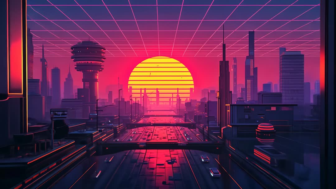 - Gliding along neon expressway toward giant striped sun in retro-future cyberpunk megacity