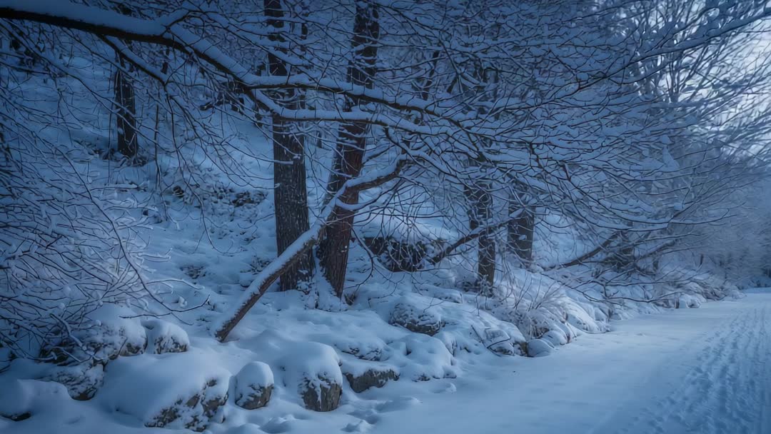 AI Generated Video. Serving as cinematic winter background for commercials, travel promos, seasonal greeting clips, nature documentaries. Offering slow tracking movement along snow-covered trail, highlighting quiet mood and providing clear space for text overlay along right side. Evoking cold, calm, contemplative emotions, suiting meditation, wellness, and ambient music videos. Providing textured foreground of rocks and embankment for cutaway B-roll or transition shots. Suiting stock libraries, website hero loops, social media reels, broadcast promos, and travel vlogs. Suggesting color grading toward cool blue tones and gentle vignette to enhance twilight atmosphere.