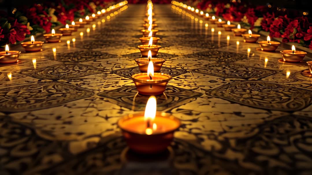 - Gliding Camera Along Row of Lit Diyas on Patterned Floor with Red Flowers