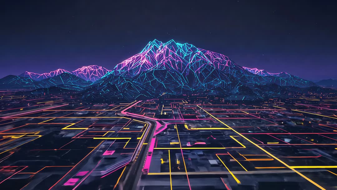 AI Generated Image. Nighttime aerial sequence showing neon-lit grid city with magenta and cyan light trails leading toward wireframe mountain range. Camera gliding forward along pink avenue while grid lines pulse and reflect on dark streets, creating strong sense of motion and depth. Wireframe mountains glowing with neon edges for dramatic contrast and futuristic silhouette. Color palette featuring cyan, magenta, purple, and deep navy for high-contrast synthwave aesthetic. Featuring forward dolly movement, wide-angle composition, cinematic aspect ratio, and slow ramping speed for dramatic reveal. Useful for motion graphics, title sequences, music video intros, technology commercials, sci-fi trailers, website hero backgrounds, event visuals, and virtual reality demos. Ideal for promoting cyberpunk games, electronic music festivals, AI or blockchain launches, and urban futurism editorials. Compatible with overlay text, lower thirds, animated transitions, or loopable background usage. Providing flexible footage for branding, VFX plates, gallery projections, and promotional trailers.