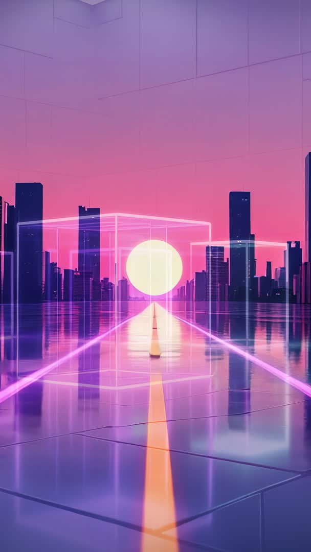 AI Generated Image. Vertical cinematic video showing camera gliding over reflective neon plaza toward pulsing sun-like orb nesting inside glowing cube. Vibrant pink and purple palette bathing futuristic skyline while mirrored floor doubling light geometry. Leading lines and symmetrical composition guiding viewer gaze into deep perspective as neon frames and holographic rails merging with reflections. Smooth forward motion and ambient synthwave mood creating immersive sci-fi atmosphere ideal for modern tech visuals. Use cases: - Serving as opening clip for tech promo, app intro, startup pitch, product reveal - Enhancing background for music video, DJ visual, live VJ set, electronic concert - Powering social media vertical ads, reels, stories, mobile wallpapers - Supporting sci-fi book trailer, film title sequence, game cinematic, VR demo Technical notes: - Vertical 9:16 aspect ratio optimized for smartphone viewing - High contrast neon grading, soft bloom, crisp reflections - Loop-friendly composition with clear central anchor - Color palette customizable for brand matching