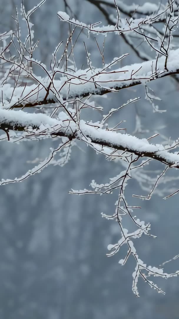 AI Generated Video. Vertical gliding footage showing delicate twigs coated in fresh snow and rime, blurred trunks forming soft blue-gray backdrop. Using shallow depth of field for closeup detail and gentle bokeh, creating calm minimalist mood. Working well for winter-themed social media reels, mobile wallpapers, meditation backgrounds, nature montages, seasonal commercials and title sequences. Editing suggestions include looping for continuous background, adding subtle wind or ambient music, slowing playback for cinematic feel, and applying cool color grading for moody atmosphere. Technical notes: vertical 9:16 aspect ratio, closeup macro framing, natural soft light, suitable for HD and 4K projects and mobile-first campaigns.