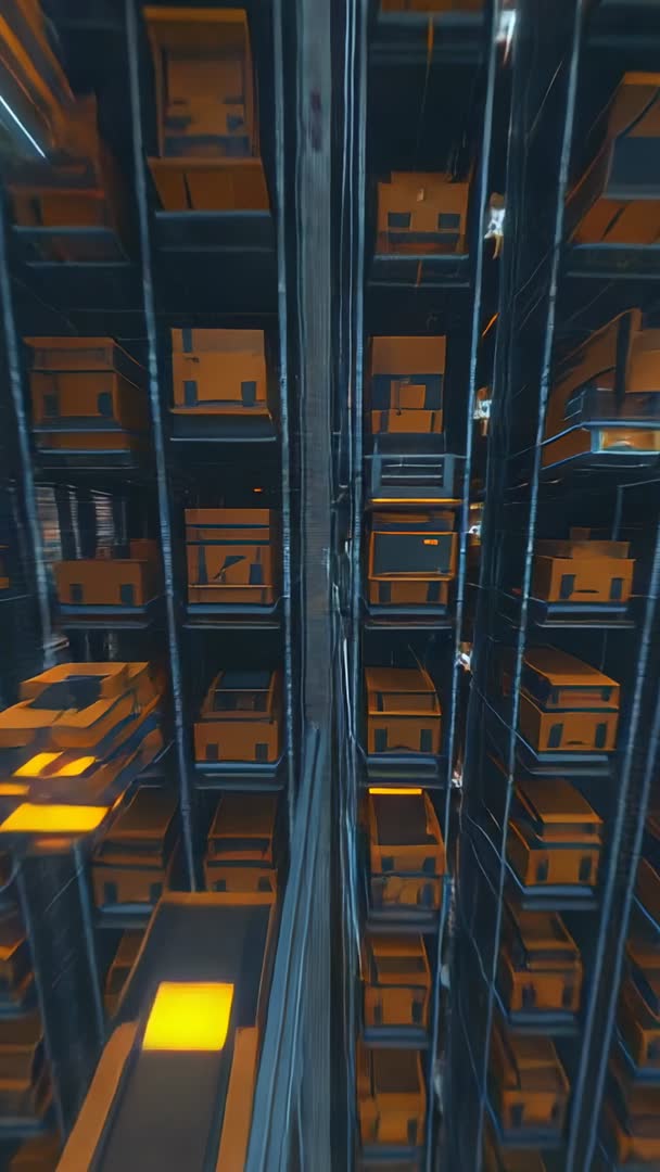 AI Generated Image. Vertical video showing gliding camera through multi-level storage shaft while autonomous shuttle is extracting orange-lit crates on rails. Rows of stacked bins and rails are creating repeating patterns and strong vertical perspective, with contrast between cool blue metal and warm orange crate lighting adding cinematic mood. Best uses include tech demos, logistics marketing, industrial automation explainers, fulfillment center walkthroughs, investor presentations, and social media vertical ads. Editing suggestions include looping clip for background, speed ramping for dramatic reveal, adding animated overlays for inventory metrics, syncing to electronic soundtrack, color grading to boost orange-blue contrast, and adding lower-third titles for narration. Clip is working well as hero background for website, presentation opener, or product launch reel focused on robotics and supply chain innovation.