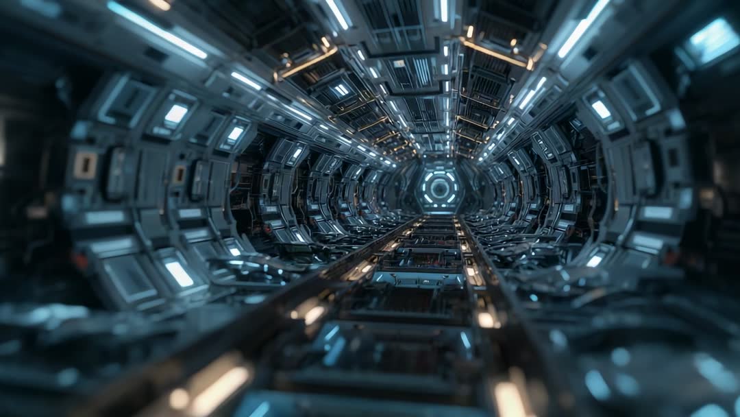 AI Generated Image. Video clip showing gliding camera traveling down futuristic modular spacecraft tunnel with illuminated bulkhead at far end. Corridor featuring concentric rings, central rail tracks, reflective metal panels, integrated LED strips, and maintenance hatches. Mood conveying high-tech tension and exploration. Ideal for film intros, sci-fi trailers, game cinematics, technology presentations, and promotional reels. Works well as title sequence background, transition plate, or editorial illustration for space topics. Post production suggestions: apply cool blue color grade, add subtle lens bloom, sync with electronic soundtrack for immersive effect. Looping guidance: create seamless forward motion by matching first and last frames or adding crossfade. Licensing note: suitable for commercial projects and creative campaigns.
