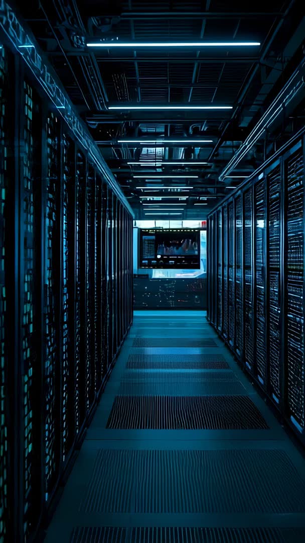 AI Generated Image. Gliding down narrow data center aisle, highlighting rows of rack-mounted servers and blinking status LEDs beneath cool blue ambient lighting. Offering cinematic vertical 9:16 footage optimized for mobile-first platforms, social media reels and stories, and app backgrounds. Supporting use in technology marketing, cloud provider promos, cybersecurity campaigns, IT infrastructure presentations, and product demo videos. Serving as dynamic background for news segment about data security, training module for system administrators, or transition clip in corporate video. Evoking high-tech atmosphere, operational scale, reliability, and precision while providing strong contrast for text overlays, lower-third graphics, and logo animations.