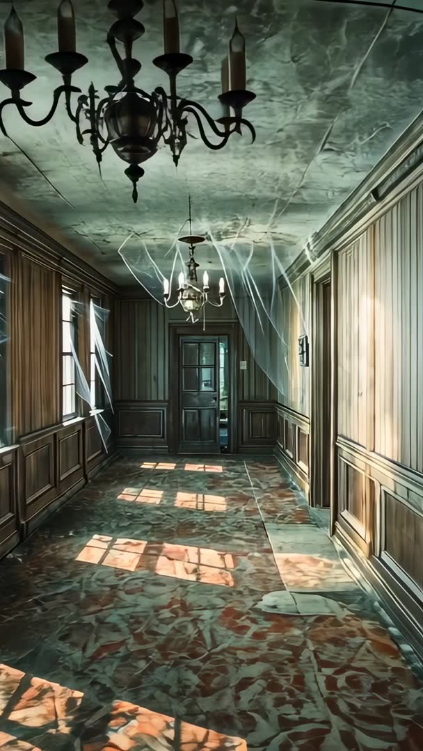 AI Generated Image. Showing gliding camera movement down long wood-paneled corridor with hanging chandeliers, drifting cobwebs, torn curtains, and patches of dusty sunlight on marbled floor. Offering slow-building tension and vintage atmosphere, suiting horror trailers, mystery promos, period drama sequences, and architectural decay studies. Working as background for title sequences, social media reels, game environment references, or production design mood boards. Providing textured surfaces and moody lighting for restoration project visuals, atmospheric storytelling, and cinematic color grading tests.