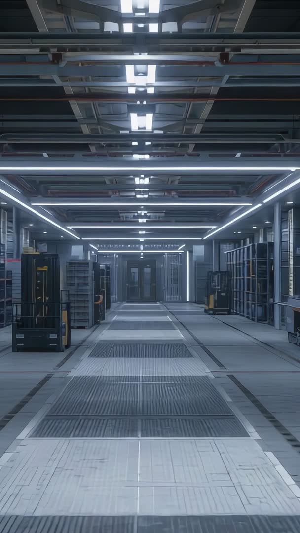 AI Generated Image. Vertical video showing smooth glide down central grated walkway inside high-tech data center aisle. LED light strips lining ceiling, tall server racks and metal shelving flanking walkway, automated forklifts stationed at sides. Cool blue-gray color palette, strong symmetry and repeating industrial details creating deep perspective and clean modern look. Usage ideas: serving as background for technology product promos, corporate IT presentations, website hero video, app intro, sci-fi short film, logistics and warehouse training, social media reels and vertical ads. Providing steady motion ideal for text overlays, logo reveals, lower thirds, transitions, and looped background clips. Technical notes: 9:16 vertical aspect ratio, slow cinematic glide, pronounced LED highlights, high detail on metal surfaces, suitable for color grading and seamless looping.