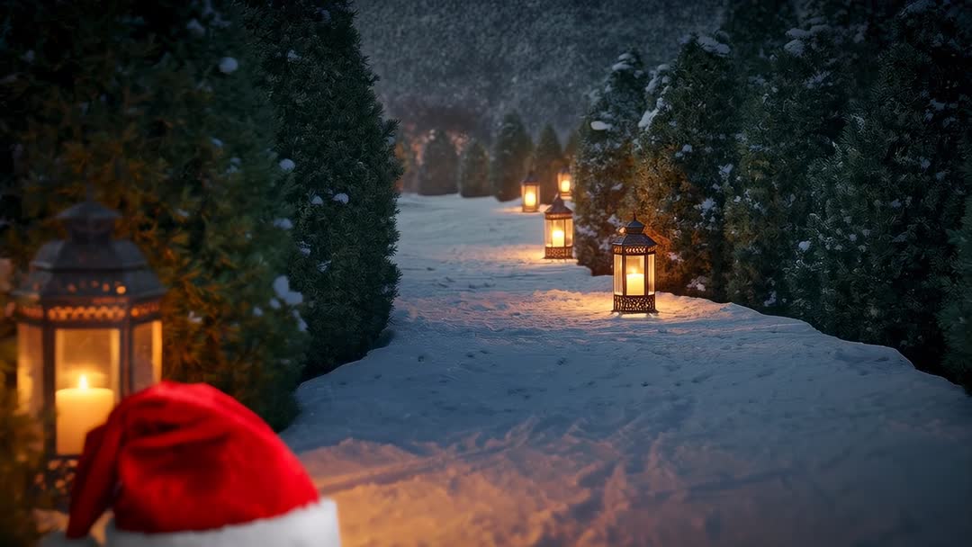- Gliding down snowy garden path revealing glowing lanterns and red Santa hat